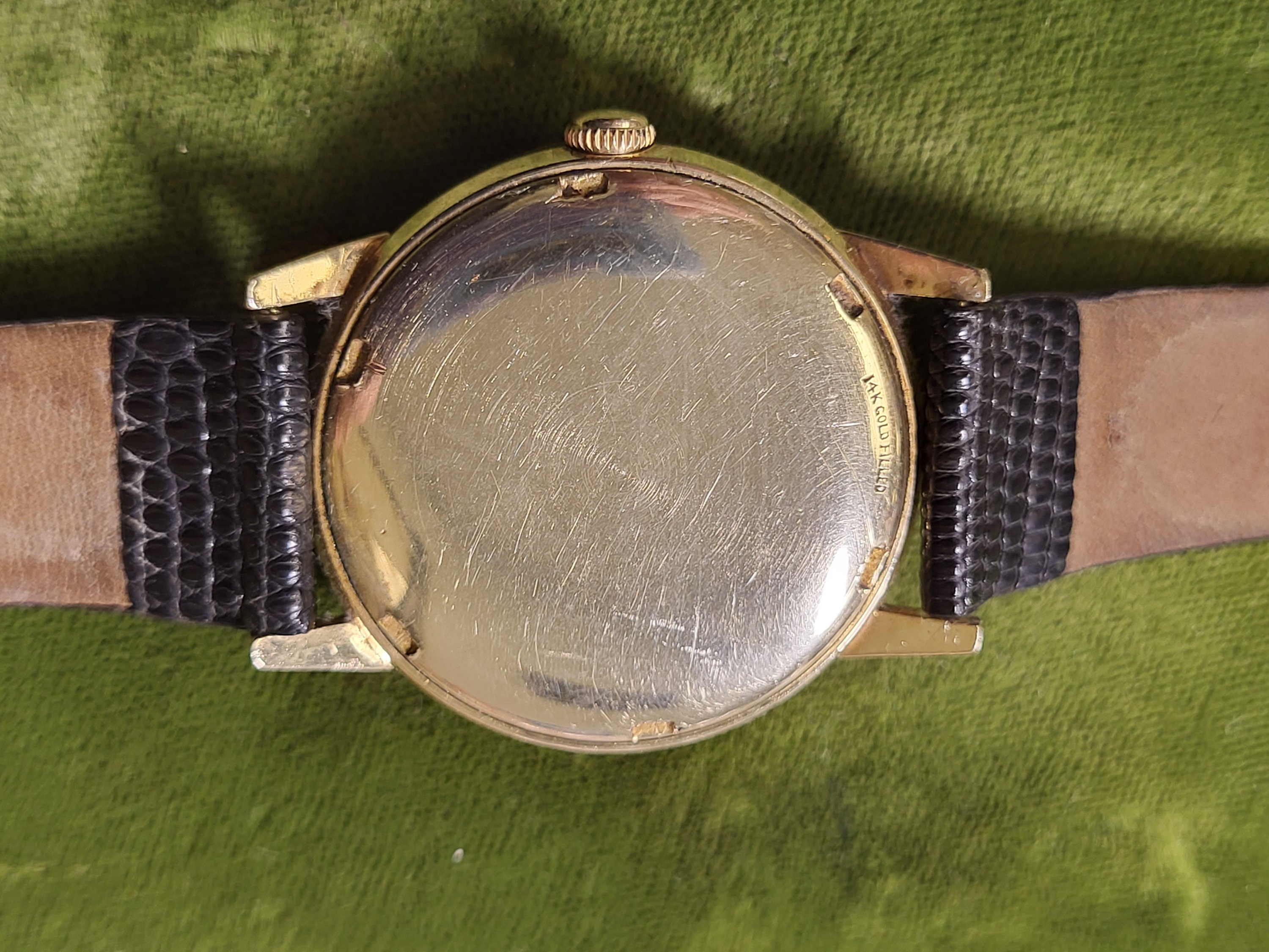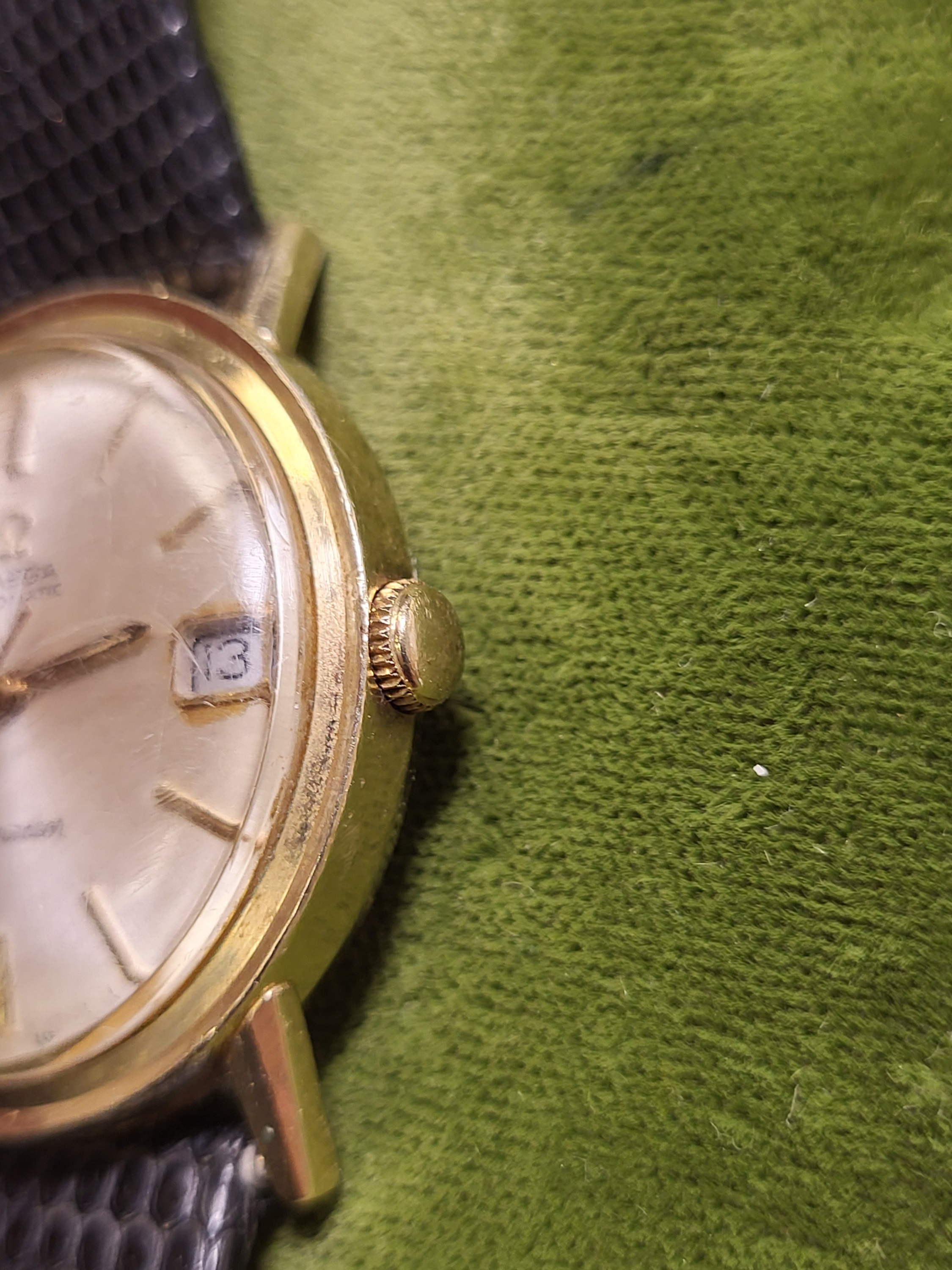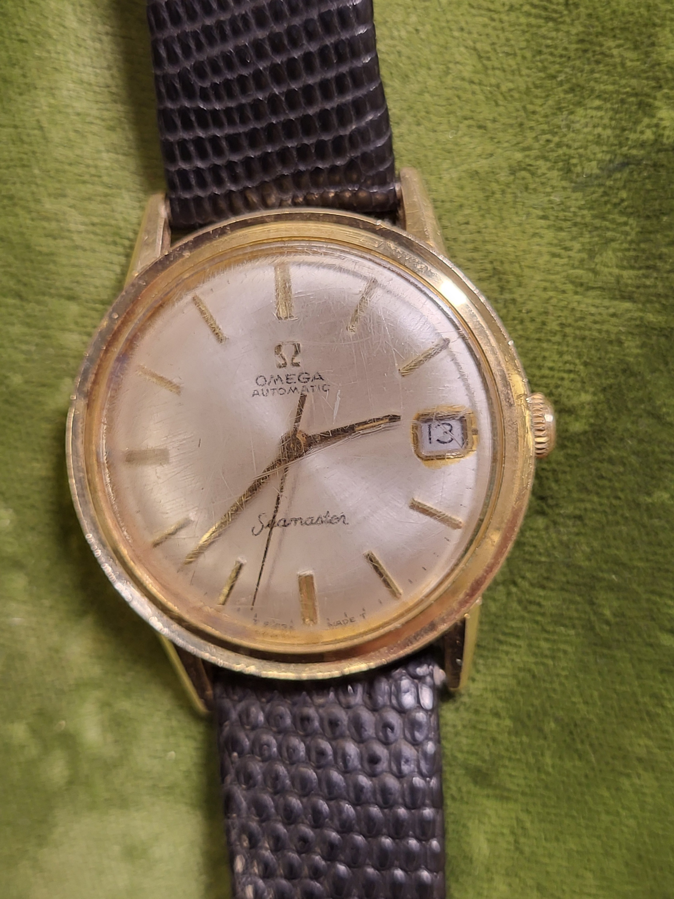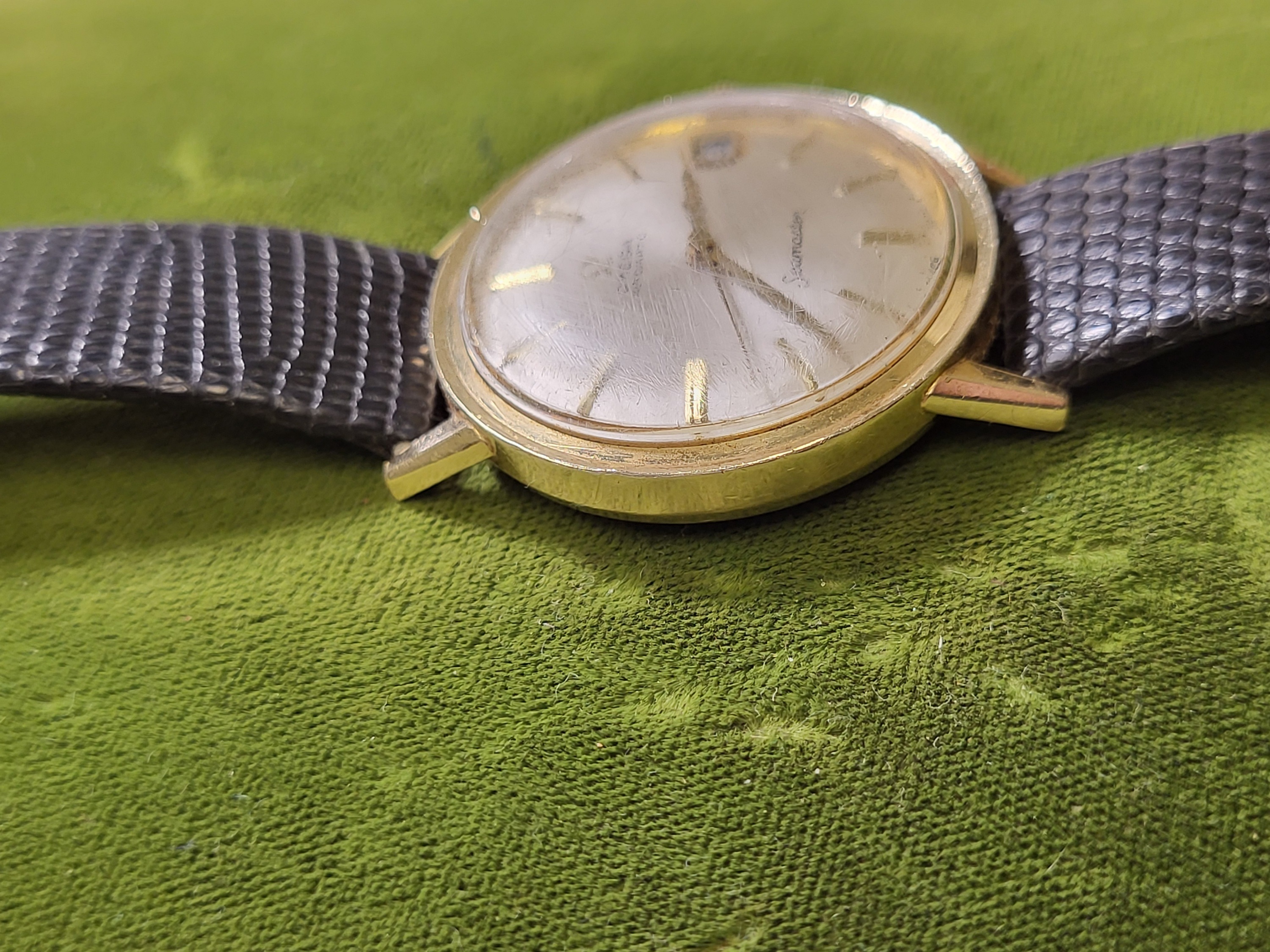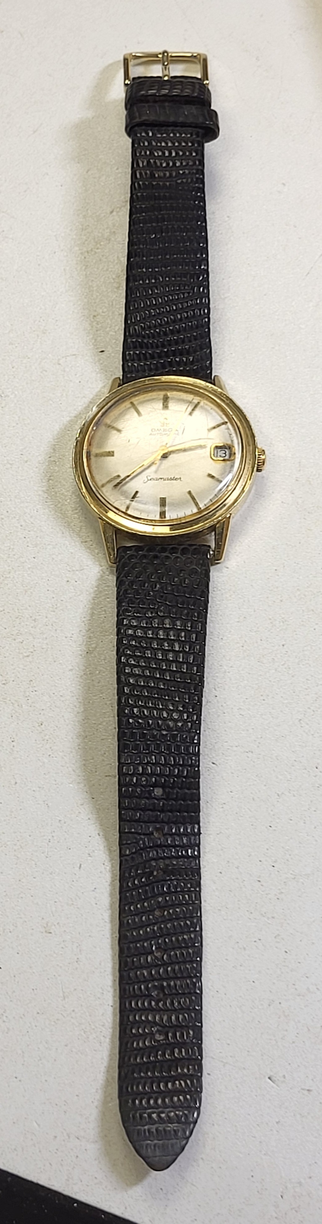 gorgeous estate watch omega seamaster with rare 14K gold filled case and back working great, 34mm case see pics w/ lizard band
