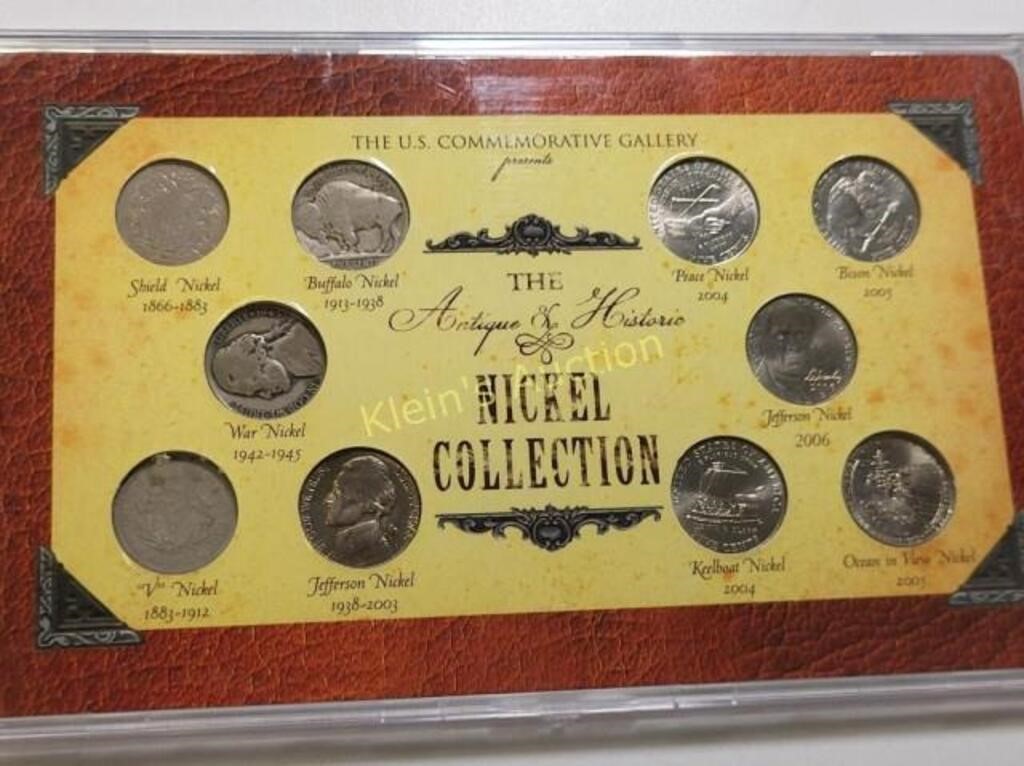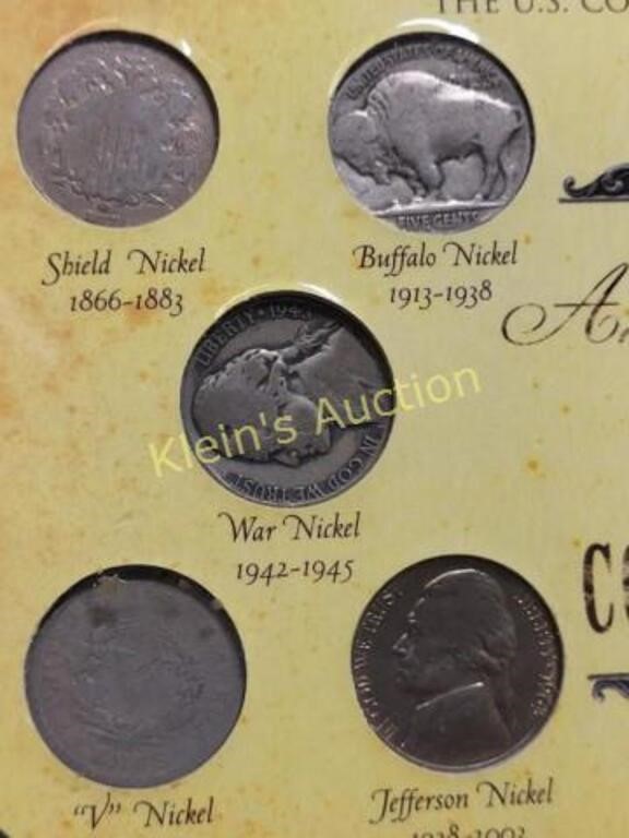 The us nickel collection buffalo shield , 1943 war, v nickel & moderns 1906 v nickel, 1935 buffalo nickel, 1867 shield nickel, 1943 silver war nickel, 1963 Jefferson and 5 moderns all 10 in set see pics