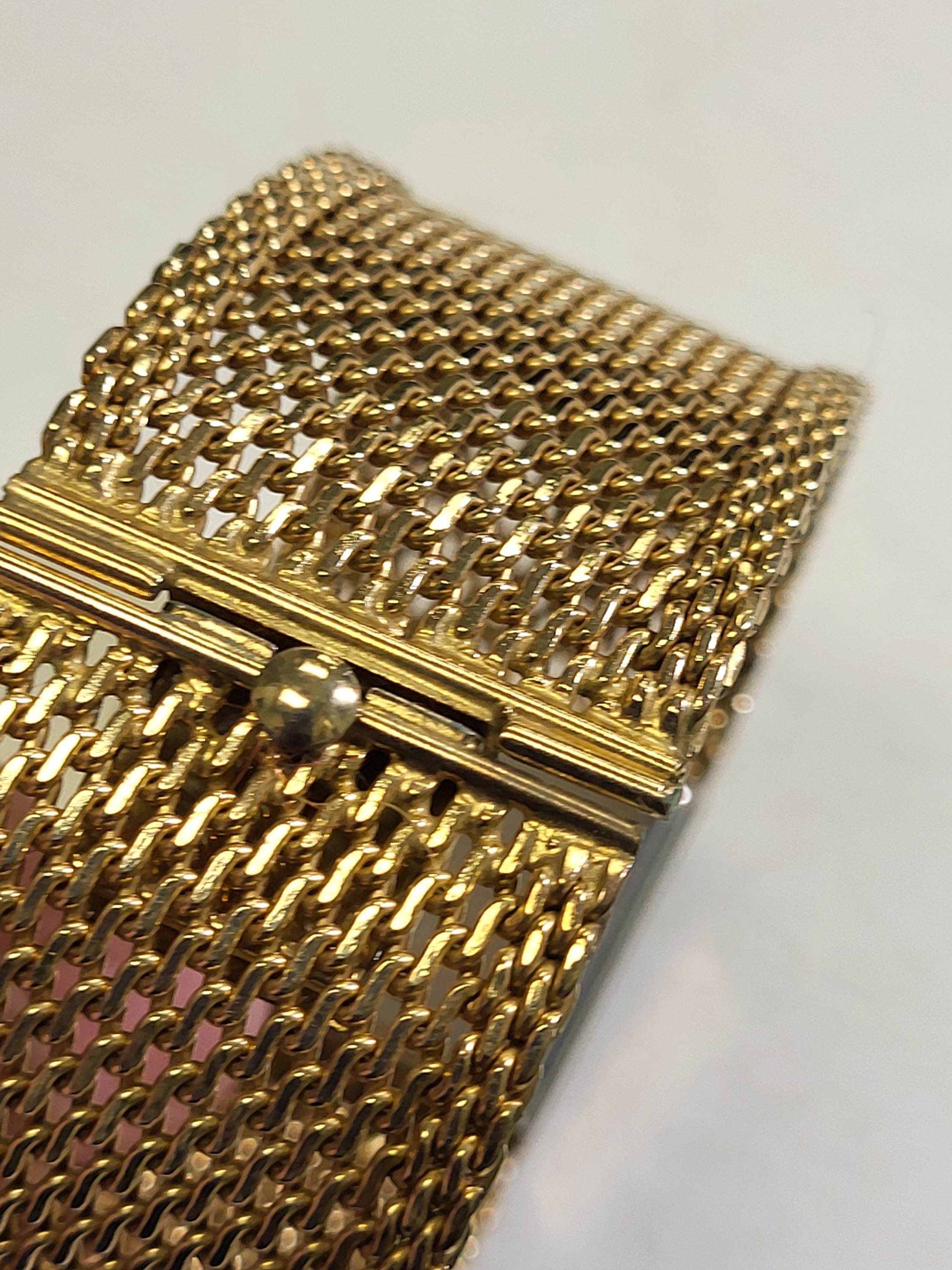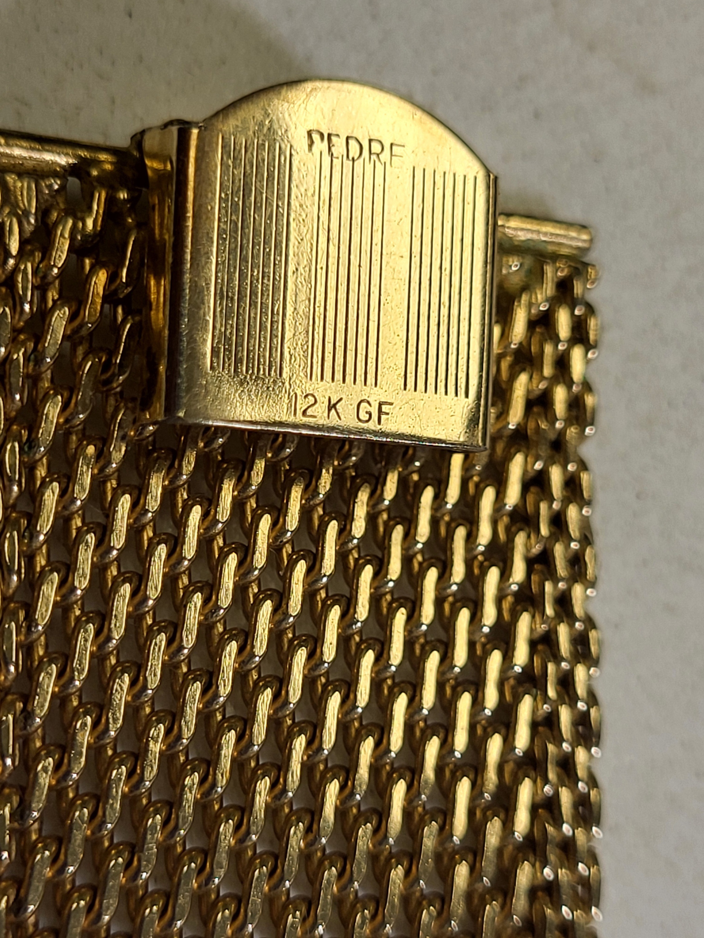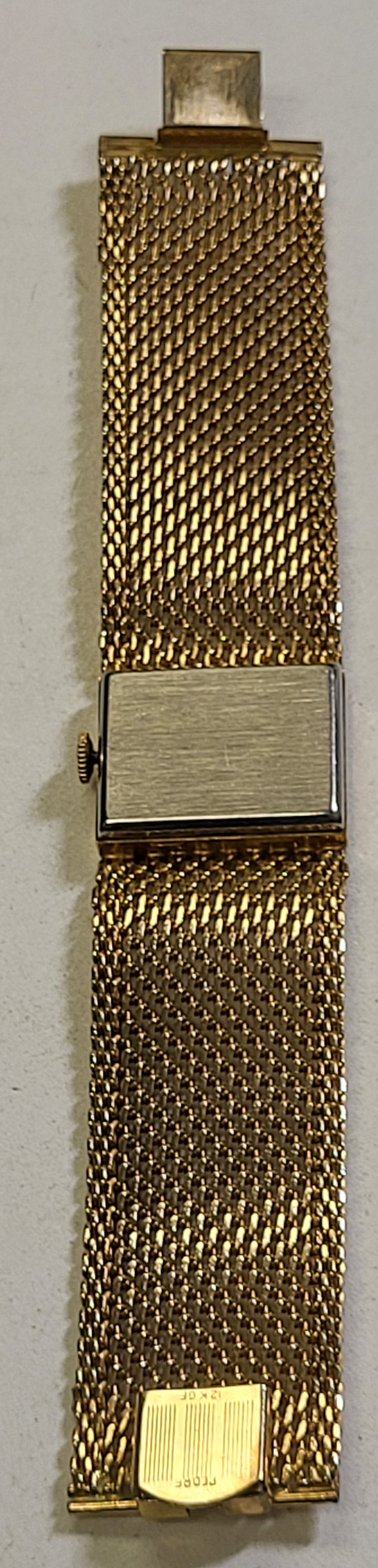 from estate near mint working great 12K gf watch and 12k gf band 27.6 mm wide and 7″ long 55.7 grams wind up watch this watch is gorgeous! think mothers day! see pics