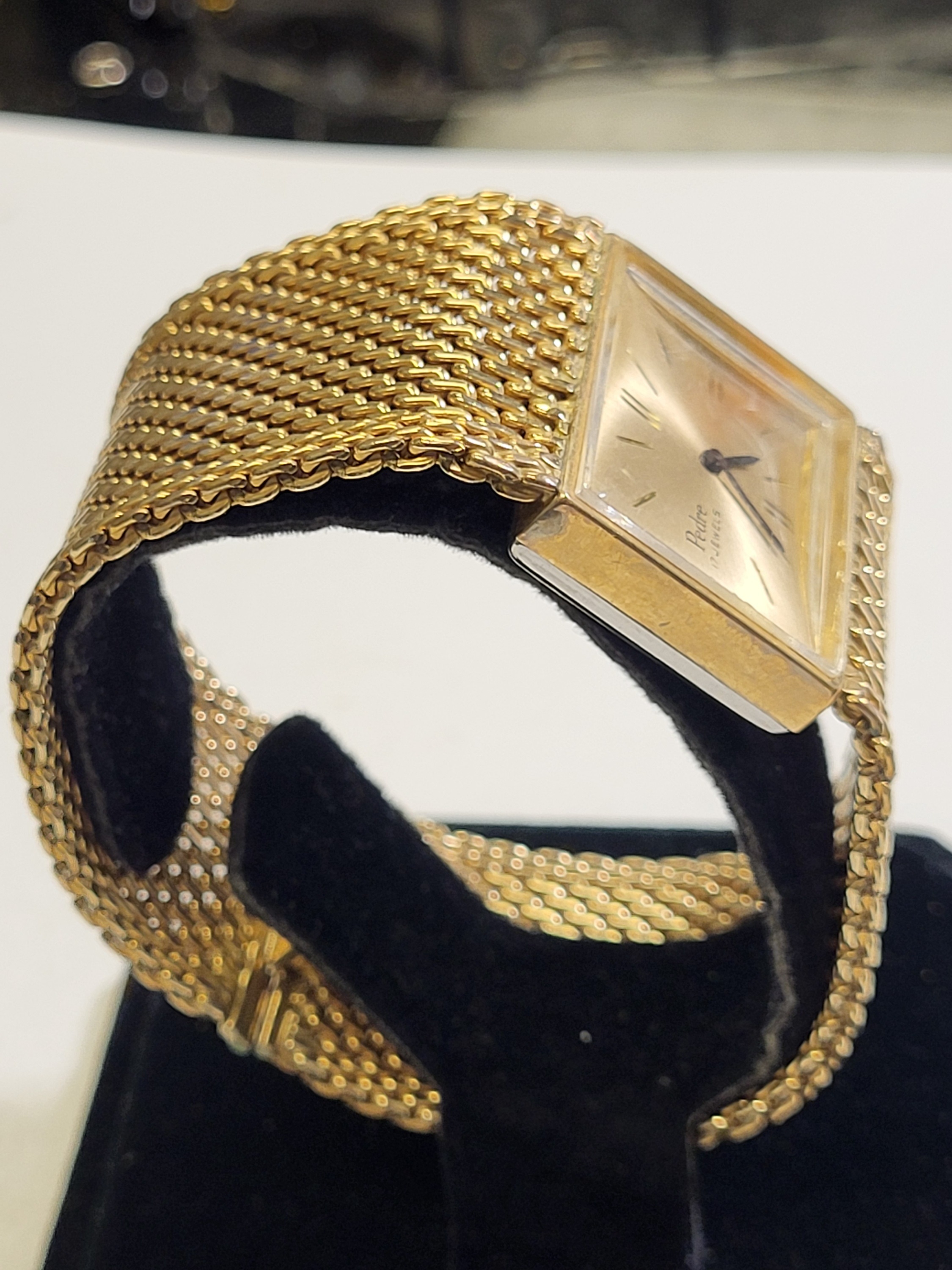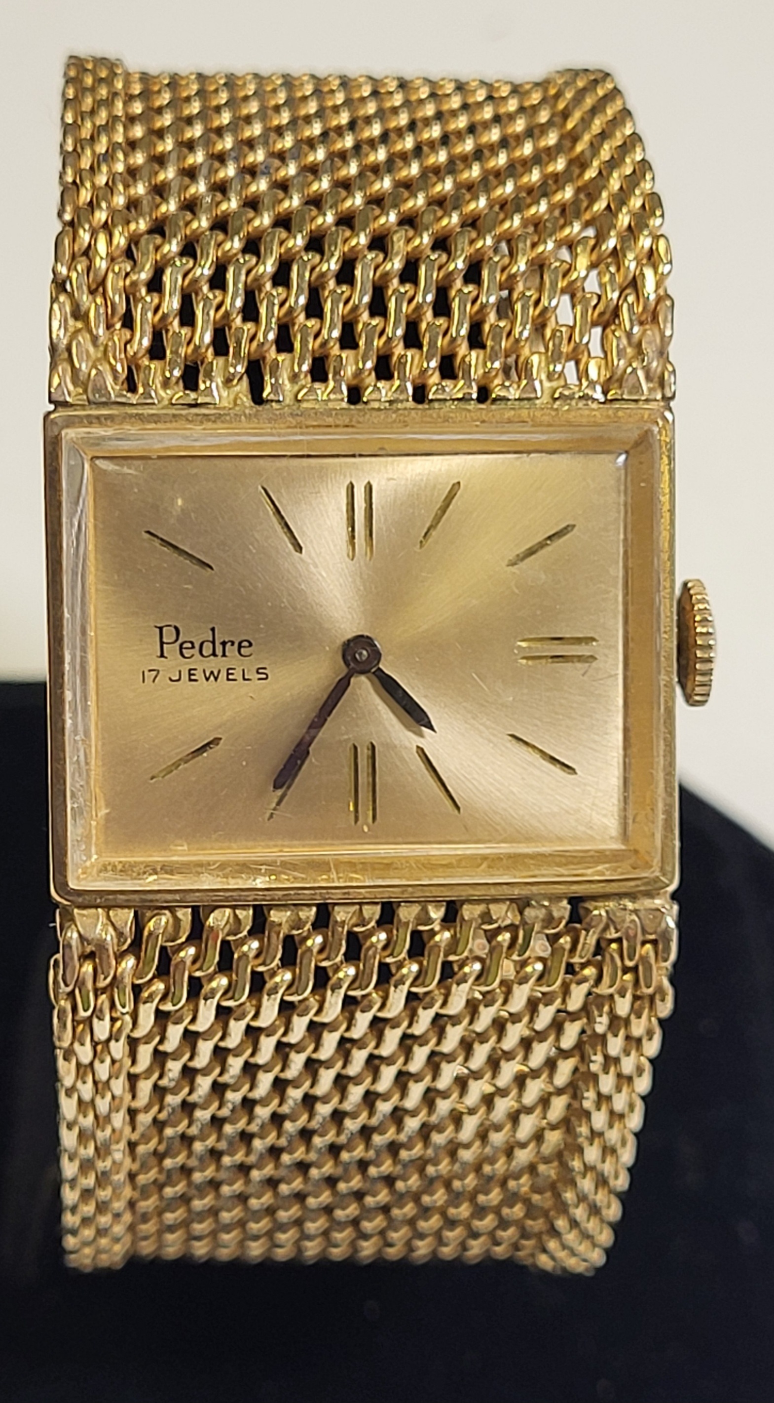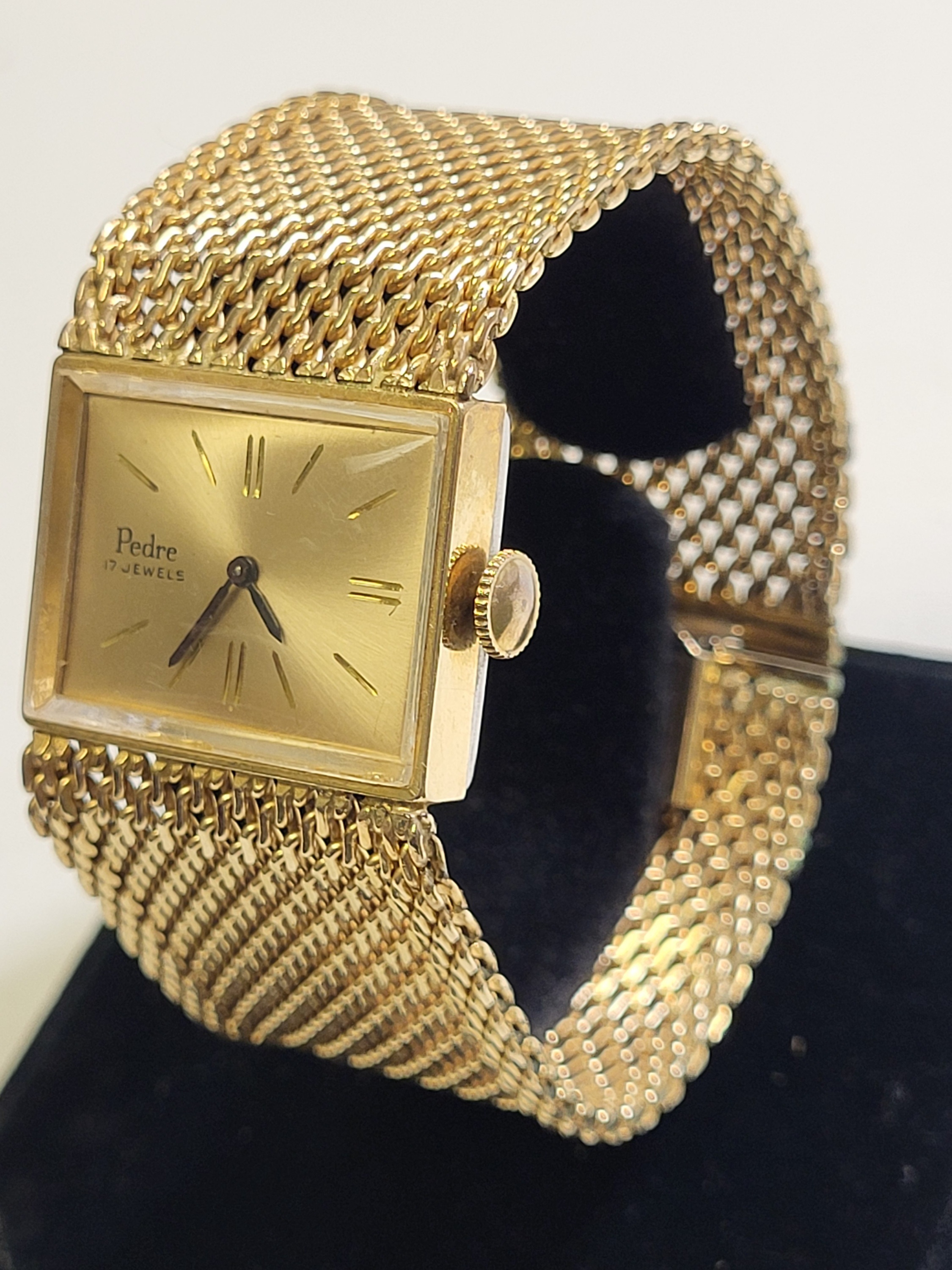 from estate near mint working great 12K gf watch and 12k gf band 27.6 mm wide and 7″ long 55.7 grams wind up watch this watch is gorgeous! think mothers day! see pics